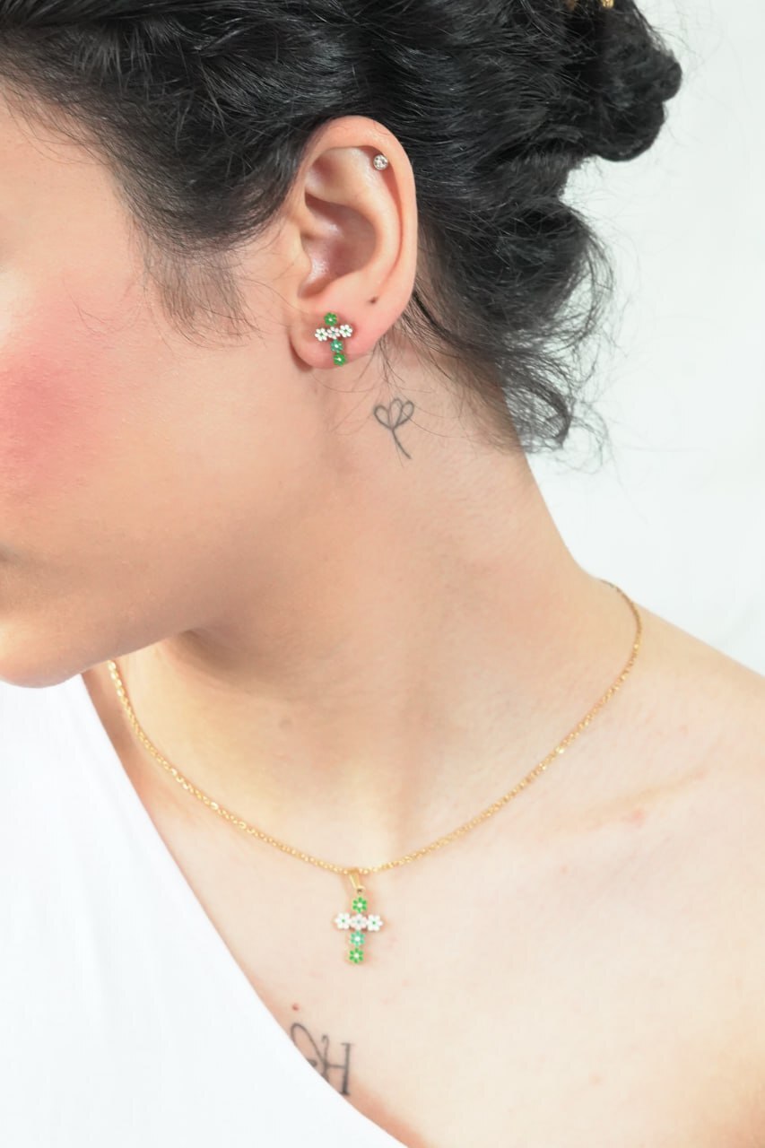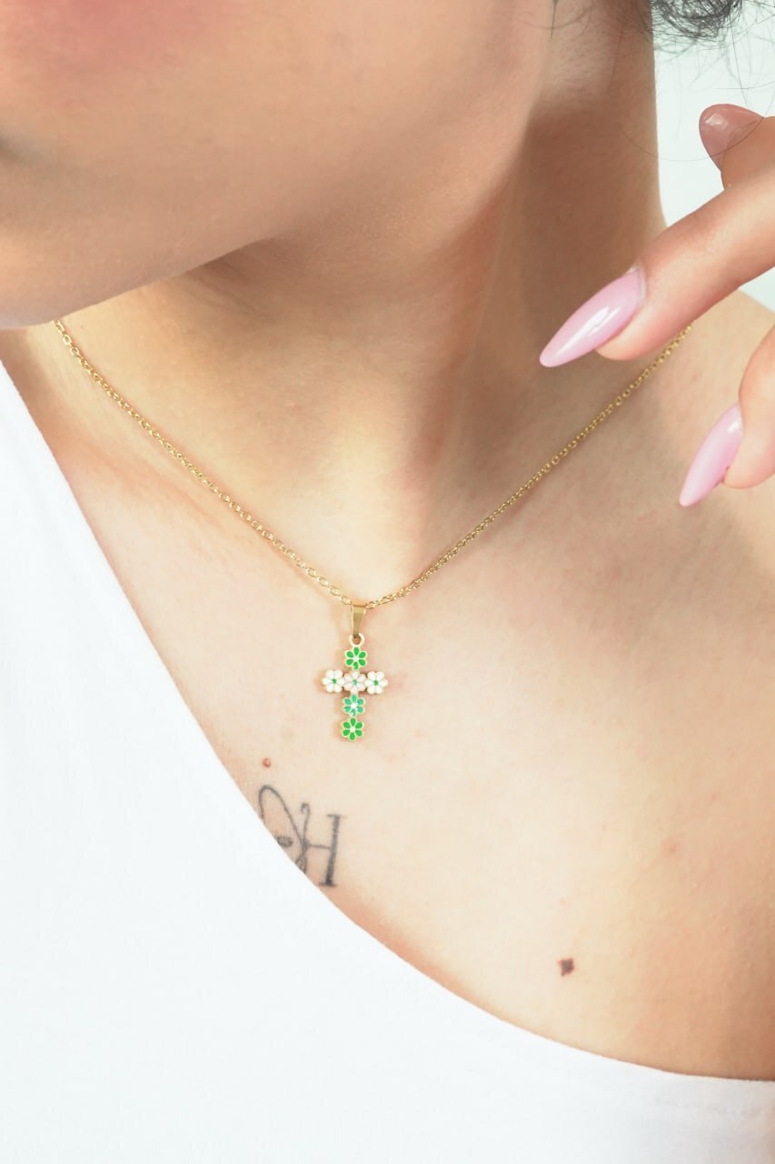 یک عدد گردنبند  و یک جفت گوشواره طرح صلیب گل دار سبز