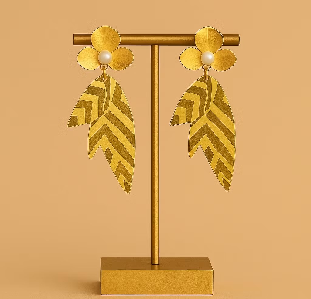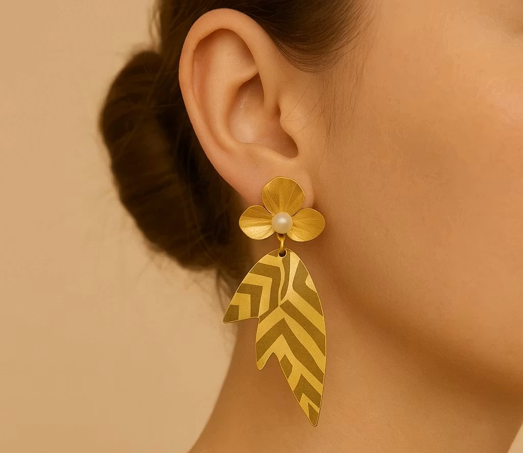گوشواره گل‌دار استیل طلایی | طرح برگ و مروارید کیموکیا