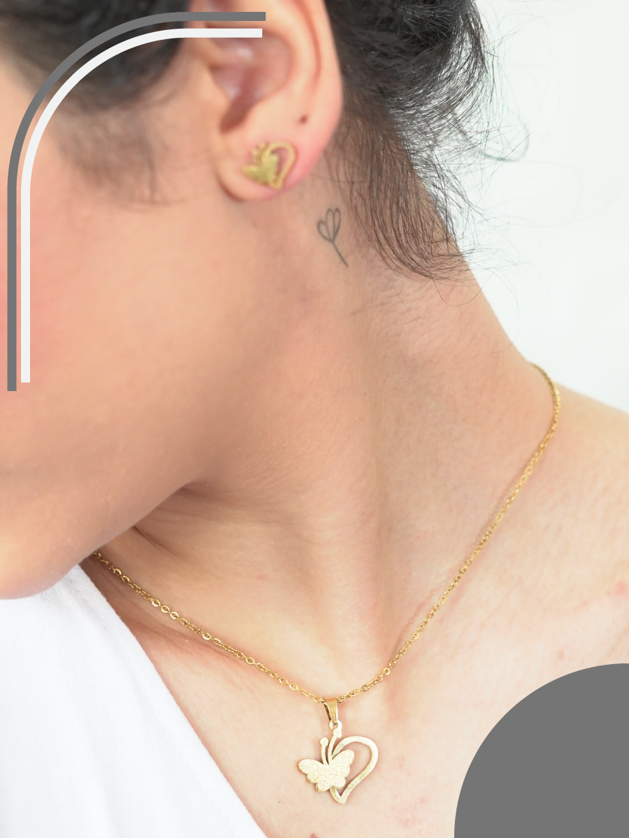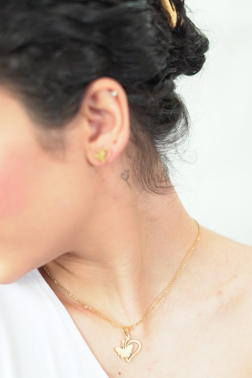 نیم ست استیل طرح پروانه  یک اکسسوری زیبا و شیک است که با طراحی منحصر به فرد خود، جلوه‌ای خاص به استایل شما می‌بخشد. این نیم ست شامل گوشواره و گردنبند است که با الهام از زیبایی پروانه‌ها طراحی شده و نمادی از آزادی و زیبایی است. مناسب برای استفاده روزمره و همچنین مناسبت‌های ویژه، این محصول می‌تواند هدیه‌ای عالی برای عزیزان شما باشد.