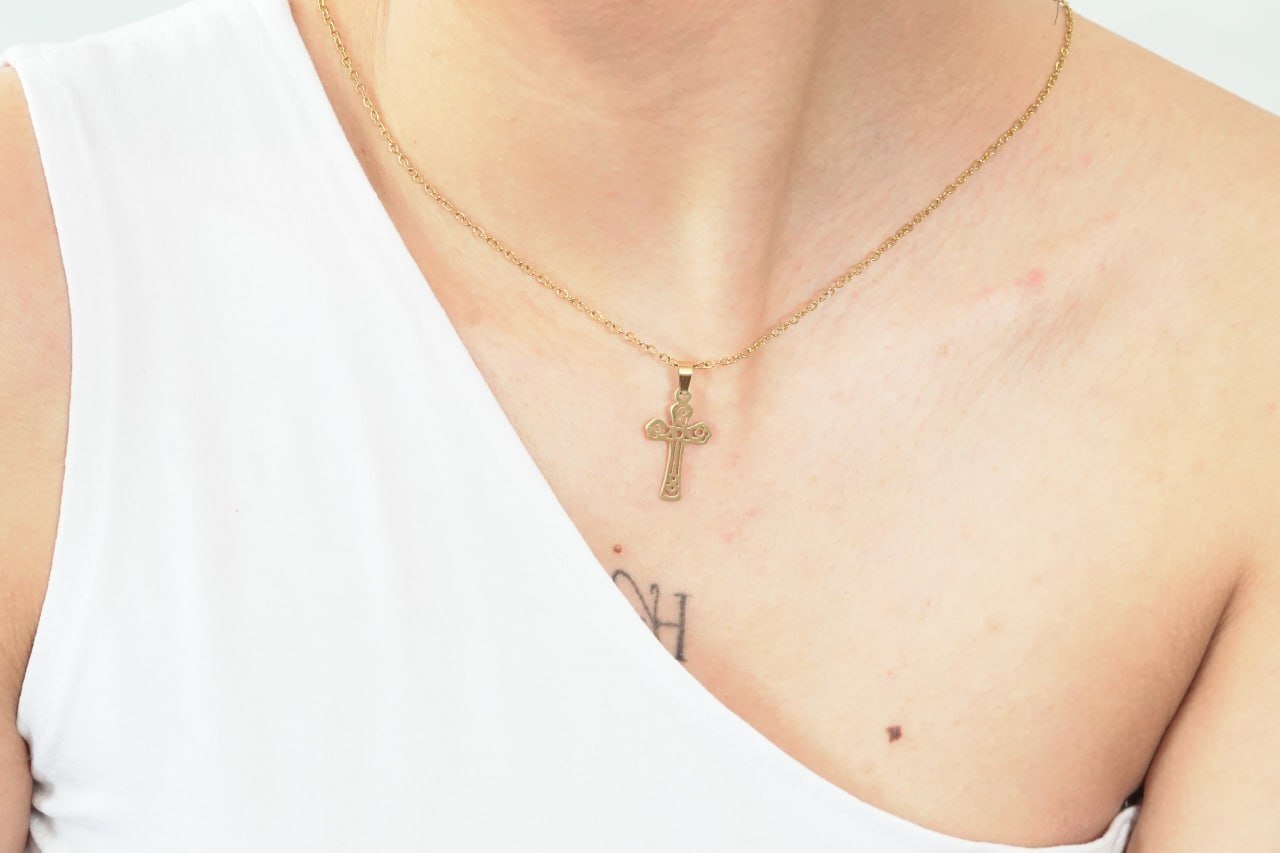 * گردنبند با آویز صلیب طلایی: با طراحی دقیق و چشمنواز.